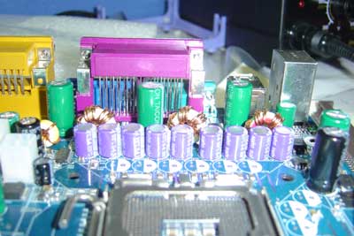 上圖為翔升915的主板,大家可以看到,CPU的輸入電容為OSCON(SANYO)固態(tài)電容。其標(biāo)稱的紋波電流可以達(dá)到5~6A,是現(xiàn)在LOW ESR電容的2倍多!