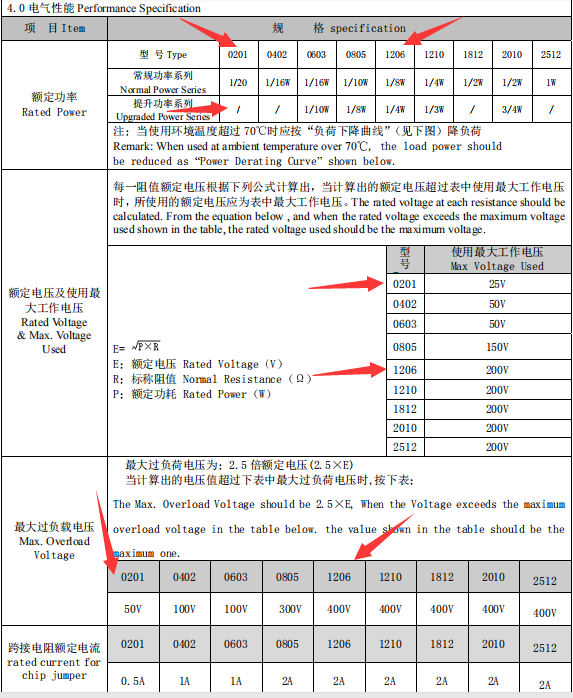 如上圖所示,0201貼片電阻的常規(guī)功率是1/20W,沒有提升功率,1206貼片電阻的常規(guī)功率是1/8W,提升功率是1/4W,0201貼片電阻的額定電壓及使用的最大電壓是25V,而1206貼片電阻的額定電壓及使用的最大電壓是200V,這里要注意的是當計算出來的額定電壓超過上面的最大電壓的時候,應當使用上面的最大電壓定為額定電壓。0201最大過負載電壓是50V額定電流是0.5A,1206的最大過負載電壓是400V額定電流是2A.。