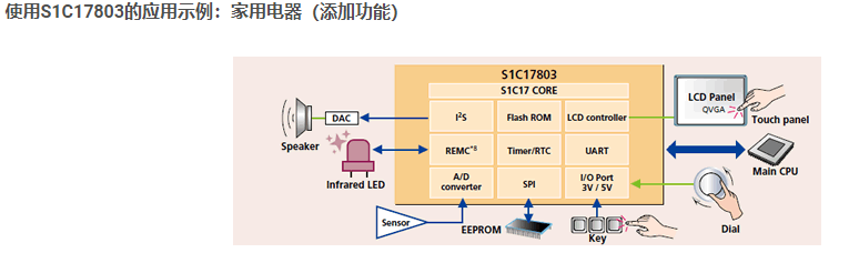 16位微處理器之S1C17800系列:該系列可以在最高48MHz的頻率下實(shí)現(xiàn)與32位微控制器類似的高級(jí)處理。它集成了LCD控制器,USB,A / D轉(zhuǎn)換器和各種I / F,例如SPI,I2C等。它適用于