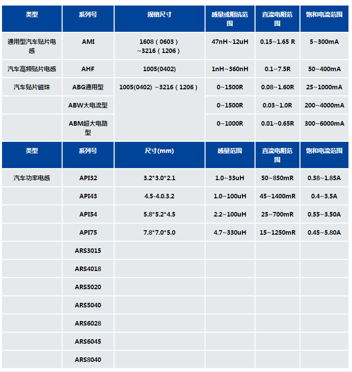 風(fēng)華汽車級電感常用規(guī)格燕通常有以下幾種:通用型車規(guī)電感AMI系列,車規(guī)功率電感API系列,汽車級高頻電感AHF系列,車規(guī)磁珠ABG,ABW,ABM系列,具體規(guī)格參數(shù)如下圖所示: