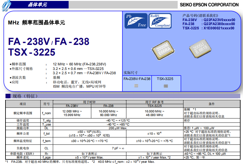 FA-238晶振,體積3.2*2.5*0.7mm。頻率范圍16-60MHZ。長度兩腳間距1.2mm,寬度兩腳間距0.7mm。四腳均無斜角變化。腳位方向從貼片晶振正面左下方逆時針順序分別為1,2,3,4.