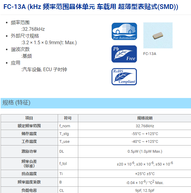 大家好,今天來給大家介紹下適用于汽車導航系統(tǒng)的32.768KHz耐高溫車載晶振FC-13A。其實FC-13A這款車載晶振還是有很多特點的,F(xiàn)C-13A是一款尺寸為3215的32.768KHz耐高溫晶振,F(xiàn)C-13A符合AEC-Q200被動元件汽車級品質(zhì)標準認證,是FC-135車載晶振設備用升級版,區(qū)別主要包括兩個方面,一是工作溫度由工業(yè)級的85℃提高到車規(guī)級的125℃所以也可以稱之為寬溫晶振,二是晶振表面材料由玻璃升級為全金屬,在抗惡劣工作環(huán)境方面有了提升。在汽車導航系統(tǒng)的設計原理中,F(xiàn)C-13A車載晶振,接入單片機后為單片機提供精準的時鐘基準,MCU可以外接LCD顯示器,內(nèi)存等器件,完成儀表的指示功能。晶振需要配置濾波電容使用,F(xiàn)C-13A耐高溫晶振可配置9pF、12.5pF的負載電容使用,下面就給大家分享下車載晶振FC-13A的規(guī)格書,看看是否是真的耐高溫晶振: