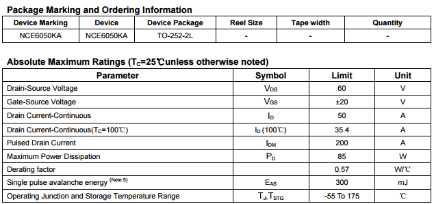 大家好 ,今天給大家介紹一款適用于60V電動車控制器的可替代國外型號的MOS管NCE6050KA。場效應管NCE6050KA是一款60V漏源電壓,50A電流,TO-252封裝的N溝道MOS管,說到60V和50A,我想甚至連不太接觸電子元器件的人也有點熟悉,好像在哪里見過,相信大家都買過電動車,一般買的時候肯定聽過電動車是60V或者48V的。NCE6050KA就是一款適用于60V電動車控制器的場效應管。目前在60V電動車控制器的應用中,MOS管主要損耗包括開關(guān)損耗(開通過程和關(guān)斷過程),導通損耗,截止損耗(漏電流引起的,這個忽略不計),還有雪崩能量損耗。只要把這些損耗控制在MOS管承受規(guī)格之內(nèi),MOS管即會正常工作。所以選取一款合適的MOS管是很有必要的,常用的60V電動車控制器有捷捷微的JMTK50N06B,新潔能的NCE6050KA,都是不錯的選擇,近期市場上NCE6050KA貌似很受青睞,我們南山電子就備有庫存,下面就給大家分享下60V電動車控制器的常用型號NCE6050KA的規(guī)格書: