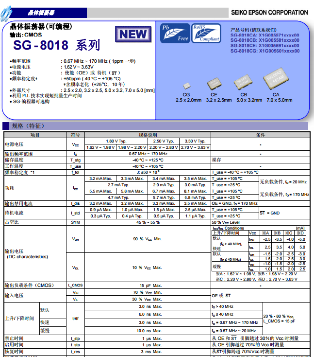 、SG7050CAN是一款日本進(jìn)口愛(ài)普生常規(guī)用途、常規(guī)7050尺寸擴(kuò)展溫度有源貼片晶振,頻率范圍1MHz ~ 170MHz,常規(guī)品為-40~85℃工業(yè)級(jí)晶振,也可以把工作溫度擴(kuò)展溫...