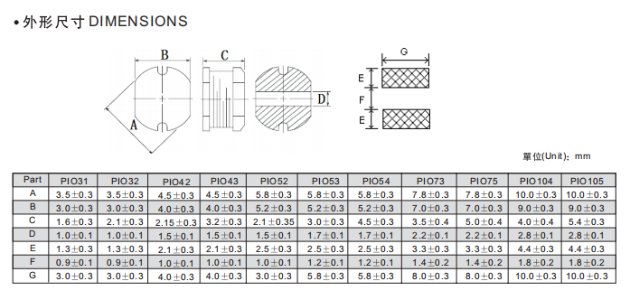 風(fēng)華高科PIO貼片功率電感一直備受市場(chǎng)好評(píng),主要原因是PIO功率電感可以完全替換國(guó)內(nèi)市場(chǎng)上常用的CD系列功率電感,其實(shí)說(shuō)替換也不對(duì),因?yàn)閮烧咭?guī)格尺寸相同,而PIO功率電感也是國(guó)內(nèi)產(chǎn)品,CD系列功率電感在國(guó)內(nèi)應(yīng)用非常廣泛,主要因?yàn)槠涓咂焚|(zhì)高Q值,耐大電流。非屏蔽鐵氧體磁芯構(gòu)造,成本較低。產(chǎn)品無(wú)鉛等特點(diǎn),而PIO功率電感其實(shí)也就是CD系列功率電感,但是畢竟出自風(fēng)華高科,PIO貼片功率電感相比于外面的CD功率電感,至少質(zhì)量上售后上都有保證的,PIO功率電感常用尺寸一般就是PIO54,PIO43,PIO75等,其實(shí)PIO功率電感和CD系列一樣:比如PIO54等同于CD54,就是直徑X高度,例如5表示直徑為5mm,4表示高度為4mm。老規(guī)矩,南山半導(dǎo)體繼續(xù)為大家分享PIO功率電感的規(guī)格書(shū),方便大家了解規(guī)格,選型參考: