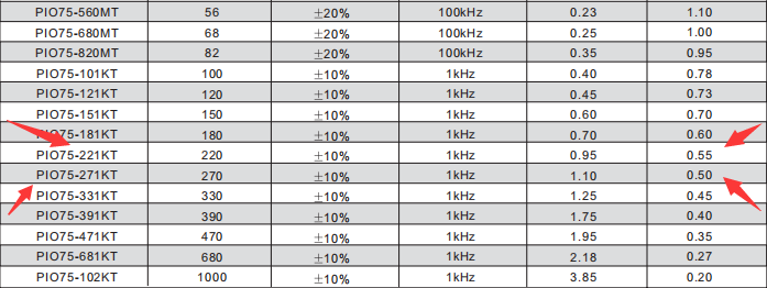270uh功率電感 PIO75-271KT 電感270uh 公差±10% 測試頻率1kHz   直流電阻MAX 1.10Ω  飽和電流0.50A
