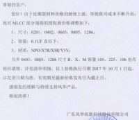 自2016年第三季度至今,被動元件價格持續(xù)上漲,至今已經(jīng)有過幾輪,風華電容近日又再一次向各代理商下方了統(tǒng)一漲價通知,最新價格生效時間為2017年10月1日。產(chǎn)品主要涉及 MLCC 和 R...