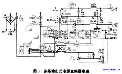 多路輸出式電源變換器電路如圖3所示。其輸入電壓為36V到90V的準(zhǔn)方波電壓,三路輸出分別為:UO1=+5V(2A),UO2=+15V(0.17A),UO3=-15V(0.17A)?,F(xiàn)將UO1定為主輸出,其電壓調(diào)整率SV=±0.4%;UO2和UO3為輔輸出,總電源效率可達(dá)75%~80%。電路中采用一片TOP104Y型三端單片開關(guān)電源集成電路。主輸出繞組電壓經(jīng)過VD2、C2、L1和C3整流濾波后,得到+5V電壓。VD2采用MBR735型35V/7.5A肖特基二極管。兩個輔輸出繞組及輸出電路完全呈對稱結(jié)構(gòu)。因?yàn)?plusmn;15V輸出電流較小,故整流管VD4和VD5均采用UF4002型100V/1A的超快恢復(fù)二極管。由線性光耦CNY17-2和可調(diào)式精密并聯(lián)穩(wěn)壓器TL431C構(gòu)成光耦反饋式精密開關(guān)電源,可以對+5V電壓進(jìn)行精密調(diào)整。反饋繞組電壓通過VD3、C4整流濾波后,得到12V反饋電壓。由P6KE120型瞬態(tài)電壓抑制器和UF4002型超快恢復(fù)二極管構(gòu)成的漏極鉗位保護(hù)電路,能吸收由高頻變壓器漏感形成的尖峰電壓,保護(hù)芯片內(nèi)部的功率場效應(yīng)管MOSFET不受損壞。