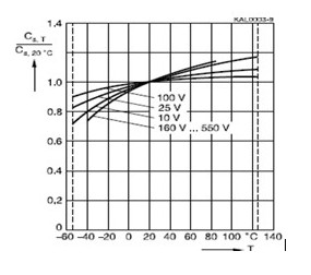 溫度對(duì)電解電容的容量有較大影響,溫度降低時(shí),電容粘性增加,這會(huì)降低導(dǎo)電性。電解電容的容值隨著溫度的降低而降低。電解電容容量-溫度特性曲線如下圖所示