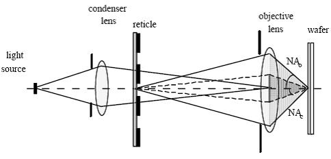 物體成像是由物鏡收集到的各級(jí)衍射光相長(zhǎng)干涉的結(jié)果。當(dāng)物鏡收集到的衍射光級(jí)次越高時(shí),衍射光包含的光掩模圖形信息越豐富,成像的質(zhì)量越高。由于物鏡數(shù)值孔徑大小的限制,不能收集到所有高級(jí)次的衍射光,而要使物體成像,物鏡系統(tǒng)起碼要收集到光掩模圖形衍射的零級(jí)光和一級(jí)光。隨著光掩模圖形尺寸的減小,根據(jù)布拉格定律,衍射角會(huì)變得越大,當(dāng)光掩模圖形的尺寸減小到一定程度時(shí),物鏡系統(tǒng)不能收集到其一級(jí)衍射光,此時(shí)光掩模圖形將無法成像,因此提出了物鏡系統(tǒng)所能成像的最小線寬即分辨率(Resolution)的概念。