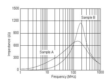 磁珠A和磁珠B的阻抗峰值都在100MHz和200MHz之間,但磁珠A阻抗頻率曲線比較平坦,磁珠B則比較陡峭。