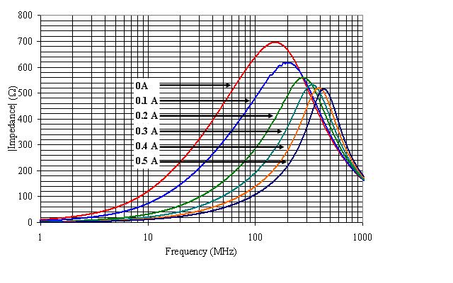 但大部分磁珠通常被放在電源線上用來濾除電源的EMI噪聲。而在有偏置電流的情況下,磁珠的特性會(huì)發(fā)生一些變化。下面是某個(gè)0805尺寸 額定電流500mA的磁珠在不同的偏置電流下的阻抗曲線。大家可以看到,隨著電流的增加,磁珠的峰值阻抗會(huì)變小,同時(shí)阻抗峰值點(diǎn)的頻率也會(huì)變高。