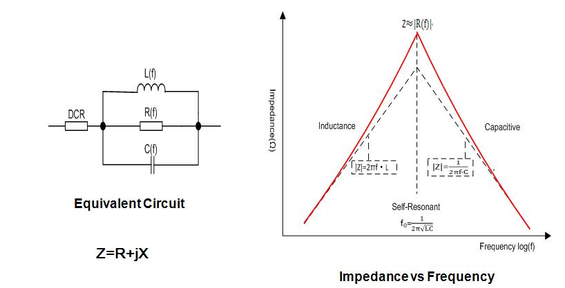 從等效電路中可以看到,當(dāng)頻率低于fL(LC諧振頻率)時(shí),磁珠呈現(xiàn)電感特性;當(dāng)頻率等于fL時(shí),磁珠是一個(gè)純電阻,此時(shí)磁珠的阻抗(impedance)最大;當(dāng)頻率高于諧振頻率點(diǎn)fL時(shí),磁珠則呈現(xiàn)電容特性。