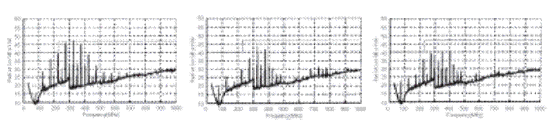 下面是上述三種情況對(duì)應(yīng)的EMI測(cè)試結(jié)果。結(jié)果是磁珠A和磁珠B都會(huì)對(duì)EMI噪聲產(chǎn)生很大的衰減。磁珠A在整個(gè)EMI頻譜范圍內(nèi)的衰減要稍好于磁珠B。