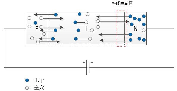 相較之下,P區(qū)與I區(qū)之間的載流子擴(kuò)散很小,幾乎可以忽略。所以在零偏置電壓的狀態(tài)下,I區(qū)與N區(qū)間的空間電荷區(qū)的載流子幾乎被耗盡,成高阻抗?fàn)顟B(tài)。I區(qū)與P區(qū)載流子移動(dòng)很少。整體呈高阻狀態(tài)。