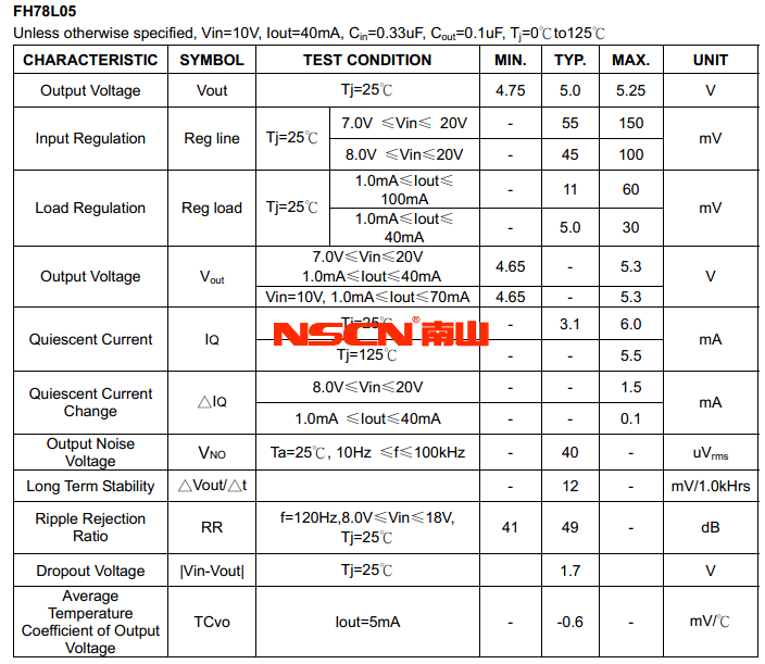 三端穩(wěn)壓器有效利用幾個固定電壓得到較寬的應(yīng)用范圍,可替代混合 的齊納二極管和電阻時,而且更低的靜態(tài)電流。適合 100mA 的各種穩(wěn)壓要求。這些電壓可以用在邏輯系統(tǒng),檢測儀器,HIFI ,和其他點子設(shè)備??梢蕴娲^熱保護 IC。以NSP-78LXX 為例,主要參數(shù)如下